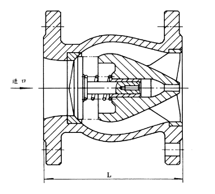 該閥由閥體、閥座、導(dǎo)流體、閥瓣.軸瓦及彈簧等零件組成。內(nèi)部流道采用流線型設(shè)計(jì),壓力損失